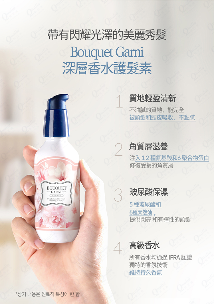 3. 提升彈性與光澤:含有膠原蛋白(Hydrolyzed Collagen)、小麥蛋白(HydrolyzedWheat Protein)、角蛋白(Hydrolyzed Keratin)、燕麥蛋白(AvenaSativa (Oat) Protein Extract)、大豆蛋白(Glycine Soja (Soybean) Protein)、甜杏仁蛋白(PrunusAmygdalus Dulcis (Sweet Almond) Protein)、米蛋白(Oryza Sativa (Rice) SeedProtein)、馬鈴薯蛋白(Hydrolyzed Potato Protein)、褐藻蛋白(HydrolyzedFucus Vesiculosus Protein)、莧菜蛋白(Hydrolyzed Amaranth Protein)、玉米蛋白(HydrolyzedCorn Protein)、棉籽蛋白(Hydrolyzed Cottonseed Protein)及玻尿酸(HydroxypropyltrimoniumHyaluronate)等成分,有助於修復髮絲結構,提升髮質彈性與光澤,讓頭髮更加健康亮麗。