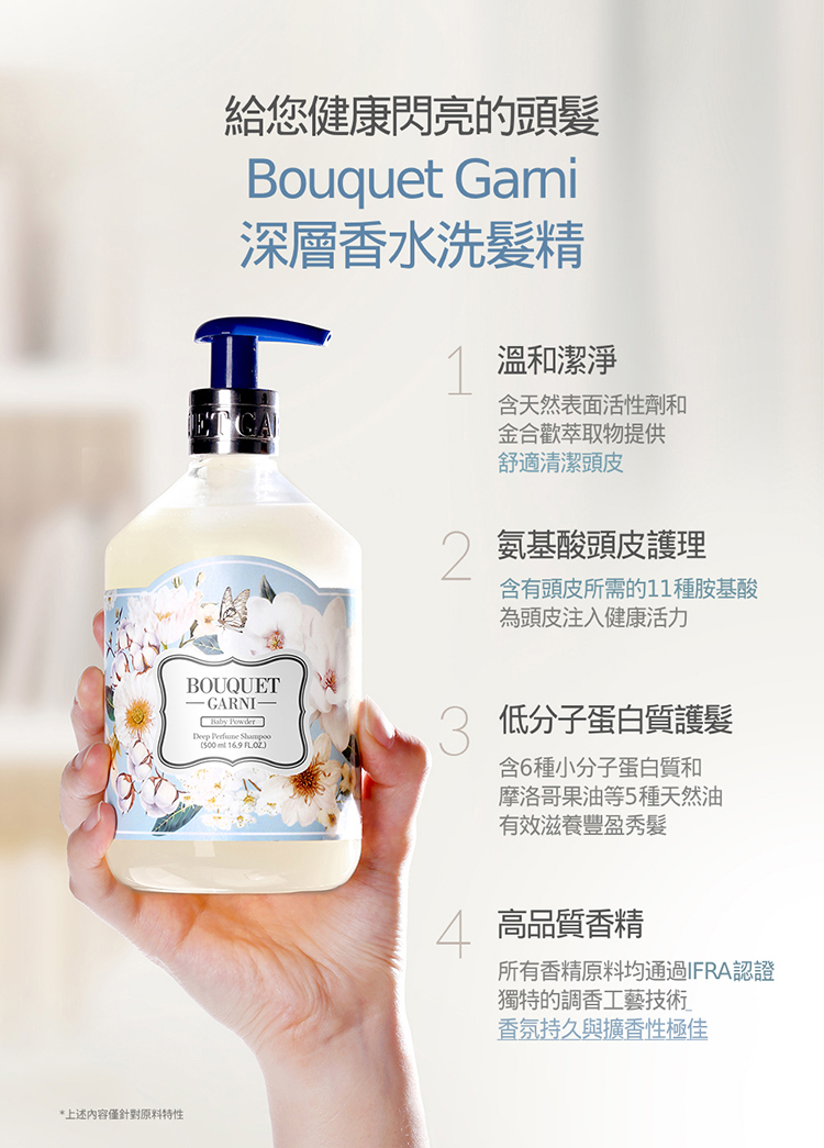 1.深層清潔與滋養:含有多種有效成分,能夠徹底清潔頭皮與髮絲,同時提供溫和不刺激的養護效果。