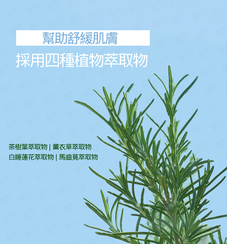 4.天然成分:富含茶樹葉萃取精華、薰衣草萃取精華等多種天然植物精華,提供全面的肌膚保養與修護。