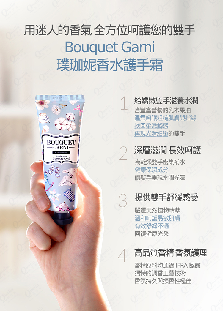 高品質香精與專業調香技術,玫瑰花園護手霜含多種高效保濕和滋潤成分,能滋養雙手肌膚,使雙手能保持柔軟和光滑。
