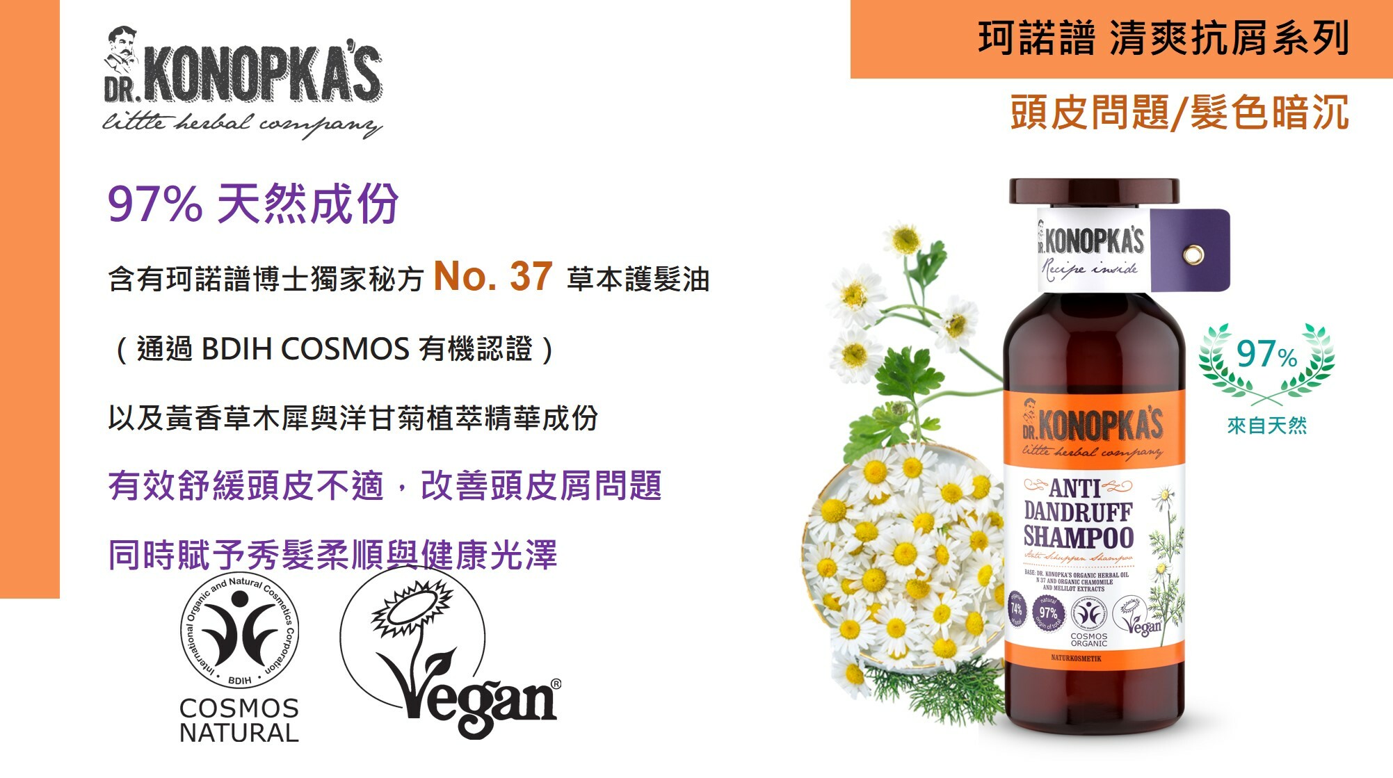 含有珂諾譜博士獨家秘方 No. 37 草本護髮油(通過 BDIH COSMOS 有機認證)以及黃香草木犀與洋甘菊植萃精華成份有效舒緩頭皮不適,改善頭皮屑問題,同時賦予秀髮柔順與健康光澤。