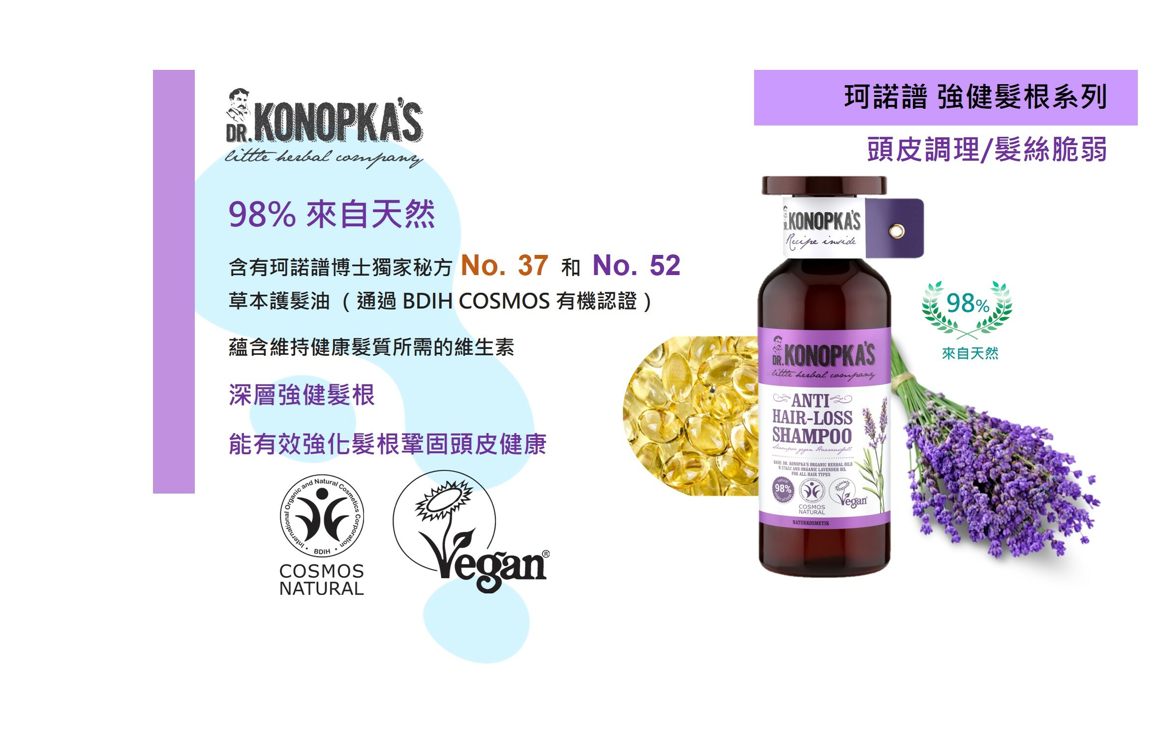 這款天然認證的強健髮根潤髮乳含有珂諾譜博士獨家秘方 No. 37 和 No. 52 特製有機草本護髮油。這些護髮油富含維持健康髮質所需的維生素,能預防髮絲脆弱斷裂,讓秀髮閃耀健康光澤。